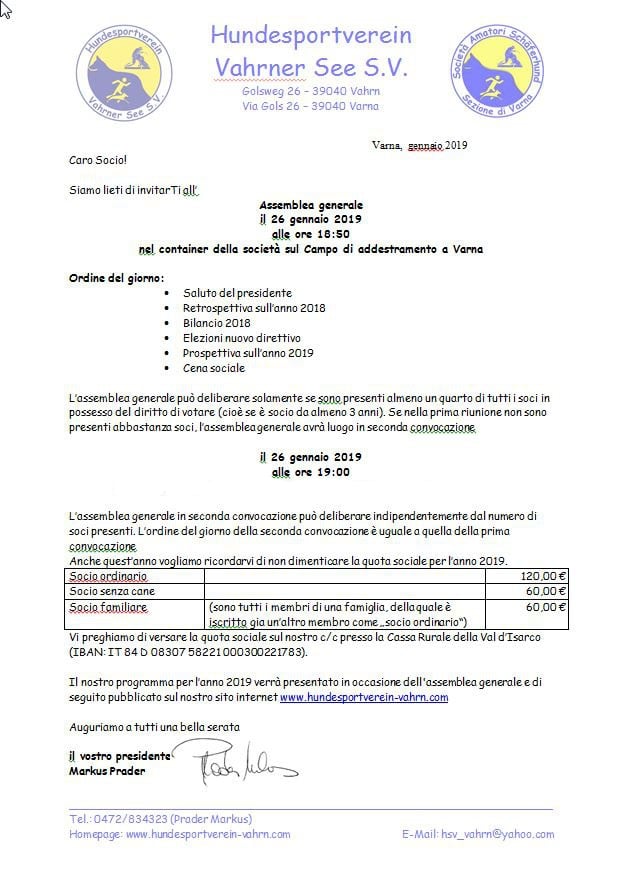 La quota sociale è rimasta uguale. Vi preghiamo di versare la quota sul nostro conto corrente.